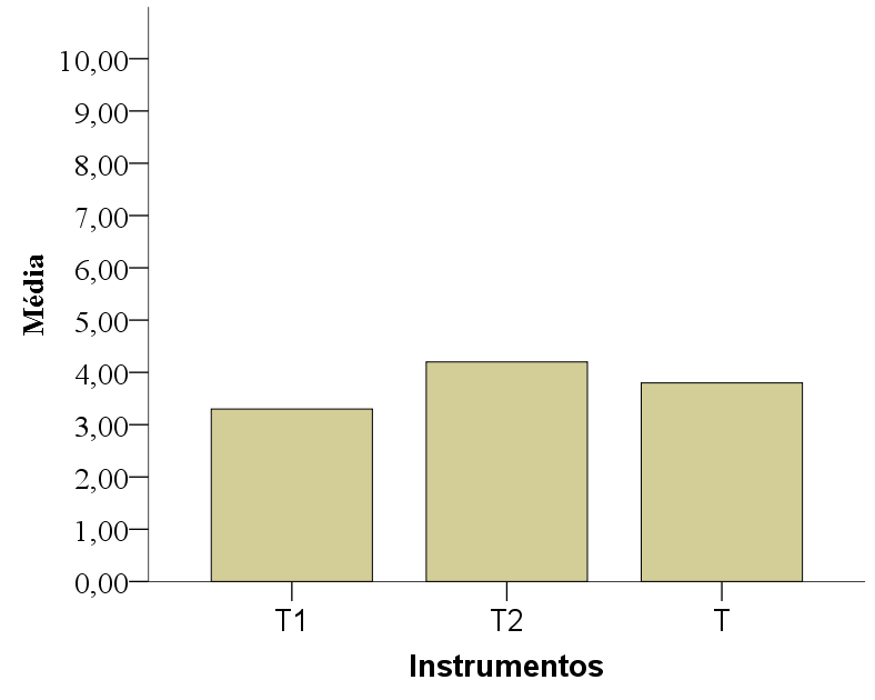 Para discussão dos resultados, chamaremos os instrumentos de T1 e T2, referindo-se respectivamente ao Texto 1 e ao Texto 2. Quando a discussão incidir sobre o desempenho geral no teste de leitura, chamaremos de Teste, designado por T, que se refere à média da pontuação obtida nos dois instrumentos.