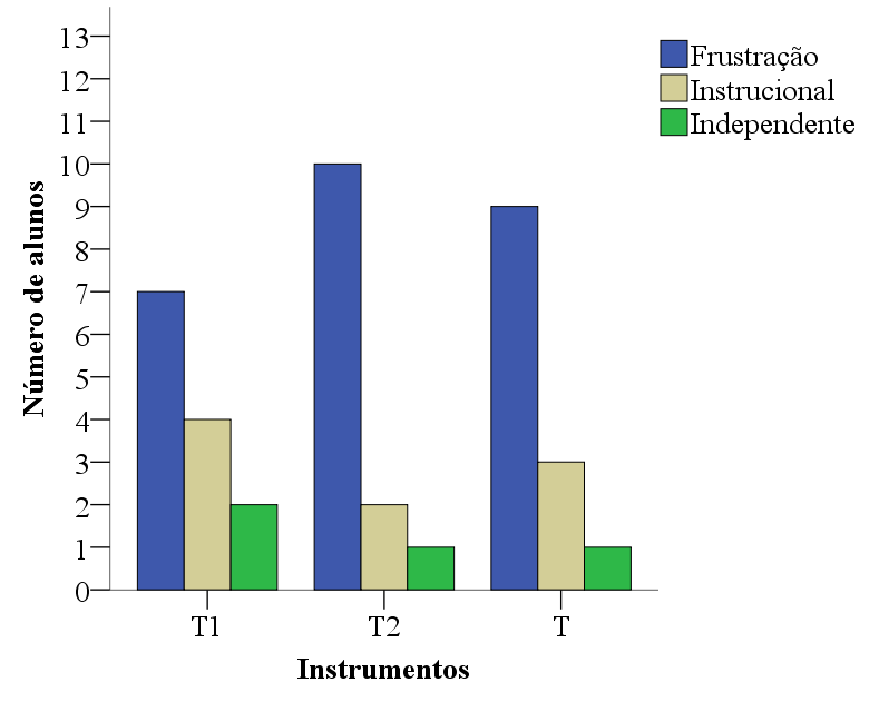 É alta a distribuição dos sujeitos no nível frustração em cada um dos instrumentos e no Teste: 54% no T1, 77% no T2 e 69% no T. Tais resultados corroboram a nossa hipótese de, assim como ser elevado o número de alunos considerados com nível insuficiente em relação à aprendizagem matemática pela Prova Brasil (FUNDAÇÃO LEMANN E MERITT, s/d), também ser elevado o número de alunos com nível insuficiente na proficiência em leitura de textos do DME. Afinal, apenas 31% dos estudantes envolvidos em nossa pesquisa podem ser considerados proficientes no T.