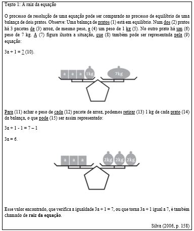 Os dados foram produzidos a partir da aplicação de um Teste de Cloze, sendo dois textos do DME, os nossos instrumentos de pesquisa. Os textos selecionados foram extraídos de um livro didático de matemática elaborado para o Exame Nacional de Certificação de Competências da Educação de Jovens e Adultos (Encceja), uma vez que identificamos que a abordagem dessa obra apresenta os conteúdos de matemática de forma um pouco diferenciada do que geralmente se encontra em livros didáticos do ensino fundamental para o ensino regular. Isto permitiu encontrar textos com extensão apropriada para o Teste de Cloze.