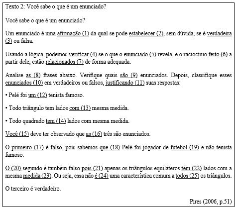 Abstract: This article presents and discusses part of the results of a research subproject developed and linked to an umbrella research project called “Linguistic approach to mathematical literacy: pedagogical theory and practice”. This clipping objective to identify the proficiency in reading textual genres of elementary school students' mathematical discourse. The theoretical bases that support our research are mathematics as a discourse and the text as a socio-discursive relationship that takes place through textual genres. Beyond these bases, we bring authors whom discuss the use of the Cloze Test to measure reading proficiency. There is a quantitative approach and is exploratory type. The data were produced from the application of a Cloze Test constituted by two texts of school mathematical discourse, our research instruments. The results point to the low proficiency of students from Elementary School in reading textual genres of that discourse and that the words with the highest semantic load had an average of correct answers above those have less semantic load.