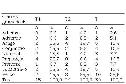 A Tabela 1 apresenta a distribuição das frequências das classes gramaticais dos vocábulos e outros mediadores visuais presentes no T1, T2 e T.