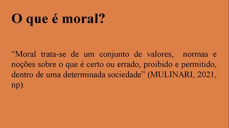 — Antes da gente continuar... acho que ficou rápido a apresentação da moral e da Ética. Elas se confundem muitas vezes, não é mesmo? A moral acaba sendo um código quase que imposto pra gente pra viver em sociedade. Existem vários códigos morais, questões morais que nos são impostas. Mentir, por exemplo, é algo moralmente errado. Uma outra coisa, ser honesto, a qualquer custo, é algo moralmente desejado. Por mais que você prejudique alguém, ou se prejudique, deve ser honesto ou honesta. Isso é uma questão moral. Muitos de nós já mentimos para evitar um castigo mais severo de nossos pais ou mentimos em outra situação para evitar o sofrimento. Ao fazermos isso, infringimos a moral, fomos imorais. Mas, você, em um certo movimento de reflexão, muitas vezes inconscientemente, acabou mobilizando a Ética.