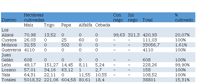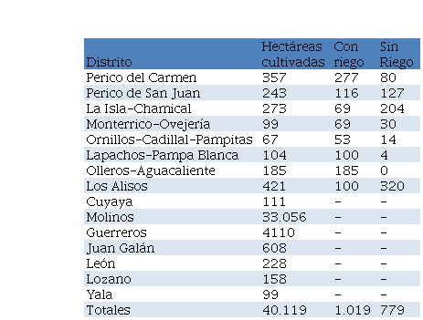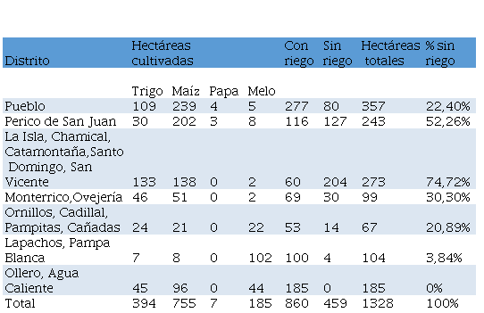 Para que los lectores tengan un cabal conocimiento de la importancia dada al riego en esta región provincial, es necesario conocer sus aspectos productivos y el sistema de riego montado para el siglo XIX. La reconstrucción de esto fue posible gracias al Censo de Ganadería y cultivos del año 1892 y 1895. A esto agregaremos los análisis que hemos logrado desarrollar sobre las acequias construidas en esta etapa, pero que no desarrollaremos ampliamente por no ser objeto de este artículo (al respecto Hernández Aparicio, tesis doctoral en curso inédita).