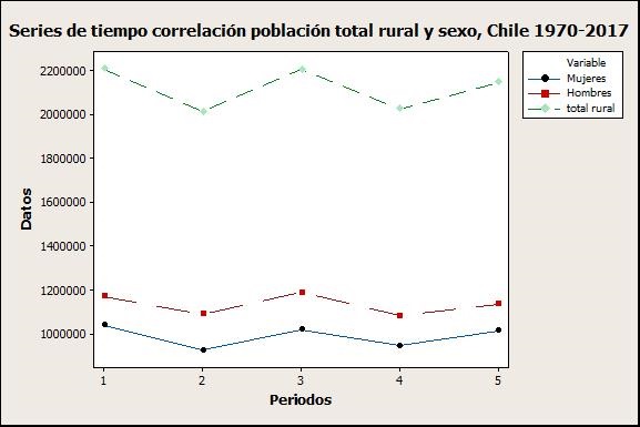 Las argumentaciones anteriores, ponen de manifiesto la complejidad de categorizar el espacio rural desde la cantidad de personas que lo habitan. Debido a ello, el siguiente análisis presenta las series de tiempo con relación a la población que habita el espacio rural en Chile, con la finalidad de establecer la tendencia poblacional desagregada por sexo, para evidenciar los fenómenos anteriormente presentados. En el gráfico 1 se muestra la correlación de variables entre población total rural y la población desagregada por sexo.