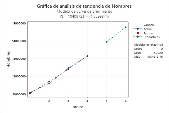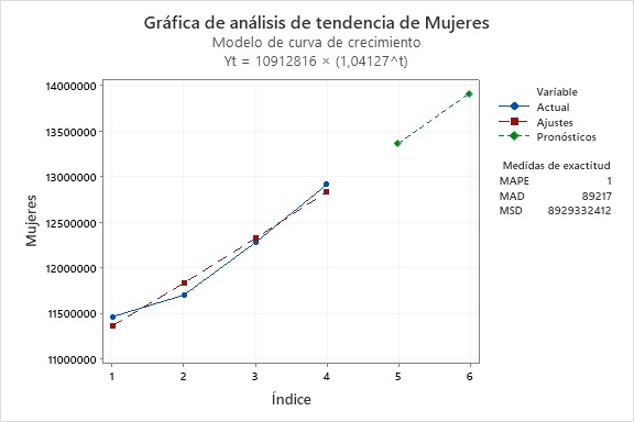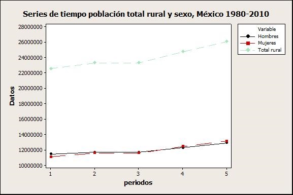 Los datos en el gráfico 2 de la serie de tiempo, evidencian una leve tendencia al crecimiento poblacional, tanto en la población rural como en hombres y mujeres. Sin embargo, la diferencia entre hombres y mujeres en su comportamiento no difiere sustancialmente porque se mantiene una misma tendencia ascendente, esta diferencia podría no ser exclusiva de un análisis sustentando en la diferencia sexual, sino en factores asociados a las transformaciones agrarias. Debido al resultado de tendencia ascendente en la serie de tiempo, resulta interesante establecer un pronóstico para los siguientes dos periodos, con el fin de determinar si el alza continúa siendo la tendencia de la población rural en México y, si existen diferencias sustantivas entre hombres y mujeres que habitan las zonas rurales.