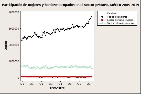 La serie de tiempo de la gráfica 4, permite percatarse de que las mujeres rurales en México continúan teniendo una menor participación como ocupadas en el sector primario, en comparativo a los hombres. Los datos demuestran, que al cuarto trimestre del 2019 las mujeres ocupadas eran 44.563, mientras los hombres ocupados para la misma fecha eran 552.079, esto evidencia que siguen existiendo diferencias importantes en el acceso al sector primario lo que en zonas rurales involucra la ganadería, apicultura, agricultura, silvicultura, la explotación forestal y la pesca. Por otro lado, la tendencia se muestra estacionaria, lo que también nos permite ver que desde el 2005 hasta el 2019 las tendencias continúan un patrón que se asocia a los periodos trimestrales recogidos (Gráfico 5). ¿Podemos evidenciar entonces una mayor participación de las mujeres en el sector primario?.