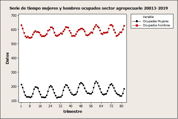 Para poder ahondar sobre la participación laboral de las mujeres rurales, dentro del sector primario, que en ambos países involucra al sector agropecuario, se realizó una serie de tiempo desagregada por sexo en el mismo sector, para poder evidenciar la tendencia de los datos y, por otro lado, ver si a través del análisis se detecta una mayor presencia de las mujeres laborando activamente en el sector (mujeres ocupadas).