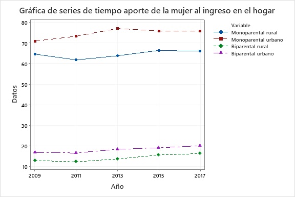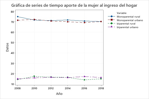 Por otro lado, la falta de ingresos en los hogares debido a las dinámicas económicas que afectan contemporáneamente al campo, han conllevado a que el acceso de las mujeres al mundo laboral transite en procesos de precarización laboral (Valdés, 2008). Lamentablemente, en las bases de datos tanto de Chile como de México, se utiliza el indicador de informalidad laboral sólo para sectores no agropecuarios, lo que evidencia también la distancia conceptual frente a una realidad que se presenta aún invisibilizada. Con relación a ello, se ha determinado importante establecer una gráfica de serie de tiempo que contenga la variable de mujeres rurales que aportan en el ingreso del hogar, según tipo de hogar y zona geográfica.