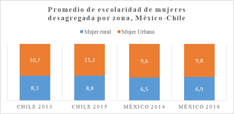 En relación comparativa, Chile demuestra que las mujeres rurales el año 2015 promediaban 8,8 años de escolarización, mientras que en México para el 2016 las mujeres rurales promedian 6,9 años. Debido a ello, se establece que hay diferencias entre ambos países siendo la escolarización mayor en mujeres rurales chilenas, proceso que se evidencia en ambas zonas geográficas. Es importante destacar que los años de escolarización son fundamentales para la disminución de la desigualdad social y la pobreza, ciertamente los estudios retomados demuestran que el acceso a la educación es menor en las mujeres rurales, pero ha existido una leve tendencia a su aumento (Fawaz y Soto, 2012; Sánchez-Muros y Jiménez, 2013), lo que permite aumentar – en hallazgo de resultados-la participación laboral y organizativa de las mujeres rurales.