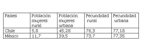 Los datos fueron analizados recogiendo el total de mujeres que declararon ser fecundas en relación a hijos nacidos vivos, para el caso mexicano involucra a niñas de 12 años y para el caso chileno a niñas de 15 años. Este dato se cruzó con el total de la población femenina en el sector rural, lo que nos permite observar en el caso chileno que del 5,8% de mujeres rurales un 76,3% tiene hijos nacidos vivos, lo que no evidencia fuertes diferencias con las mujeres urbanas, puesto que del total de su representación población un 77,18% ha tenido hijos nacidos vivos. Para el caso mexicano del 11,7% que representa a las mujeres rurales respecto al total de la población un 73,7% declararon ser fecundas, mientras que en la zona urbana representa un 77,35% (Tabla 1).