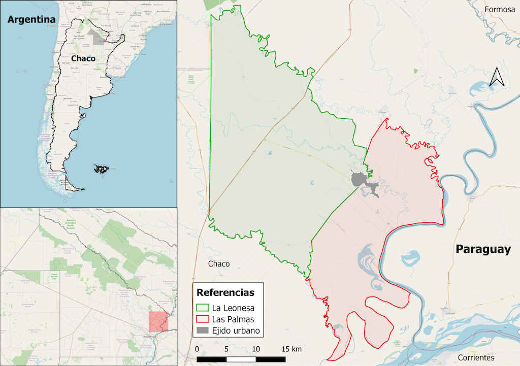 LP/LL son dos localidades del departamento Bermejo, al este de la provincia del Chaco, sobre el río Paraguay (Figura 1). Es una zona de humedales con un clima subtropical cálido sin estación seca. En términos sociales, identificamos que el espacio agrario está ocupado por una diversidad de perfiles productivos: desde empresas arroceras y estancias ganaderas que operan escalas variables de tierra y capital, hasta productores/as familiares de subsistencia. Este último sector está compuesto de familias indígenas qom y descendientes de migrantes paraguayos o de otras provincias del norte argentino.