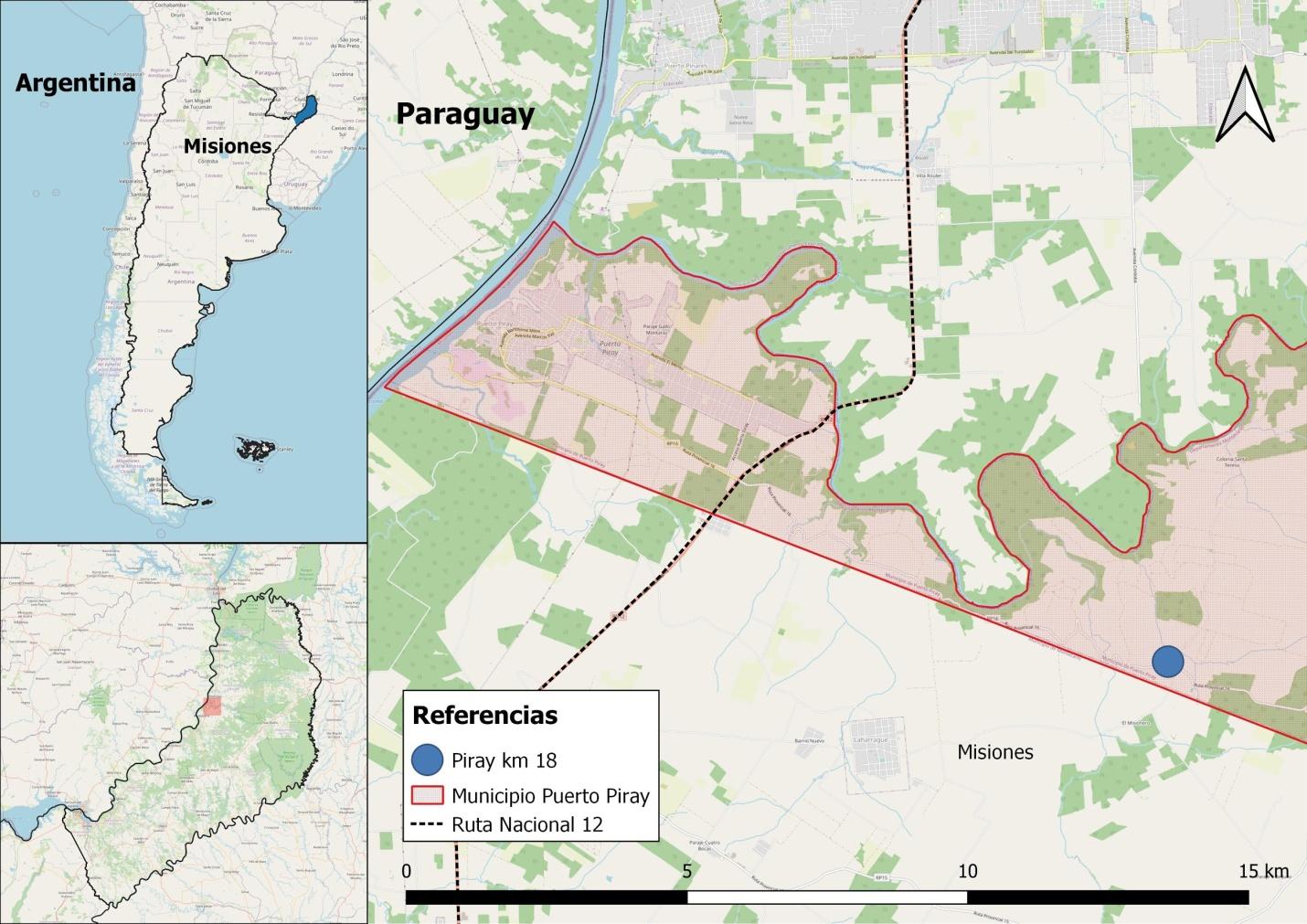Piray 18 es una colonia rural del municipio de Puerto Piray, departamento de Montecarlo, región del Alto Paraná de Misiones, frontera con Paraguay y Brasil (Figura 4). La región es húmeda, de clima subtropical, de abundantes lluvias y corresponde a la eco-región de la selva paranaense. Desde mediados de la década de 1990, se expande el agronegocio forestal y avanza un proceso de acaparamiento de tierras promovido por una empresa de capitales chilenos, ARAUCO[11], propietaria de 230 mil ha en toda la provincia y el 60% de la superficie del municipio de Puerto Piray.