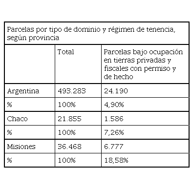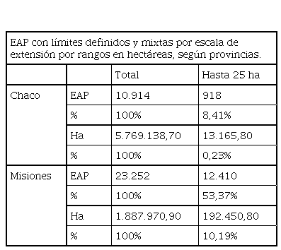 En el NEA, aunque se hayan perdido alrededor de 10.000 EAP en su totalidad menores a 50 ha entre 1988-2002 (Slutzky, 2014), las EAP familiares representan el 92% de las EAP totales de la región (Obschatko et. al, 2007). Esta región concentra situaciones problemáticas de tenencia de tierra, Slutzky (2014) lo explica a partir de la información del CNA 2002 sobre tierras -privadas o fiscales- bajo “ocupación” –con o sin permiso– que, mientras en el país eran el 7,6% de las EAP con límites definidos, en el NEA representaban el 17%.