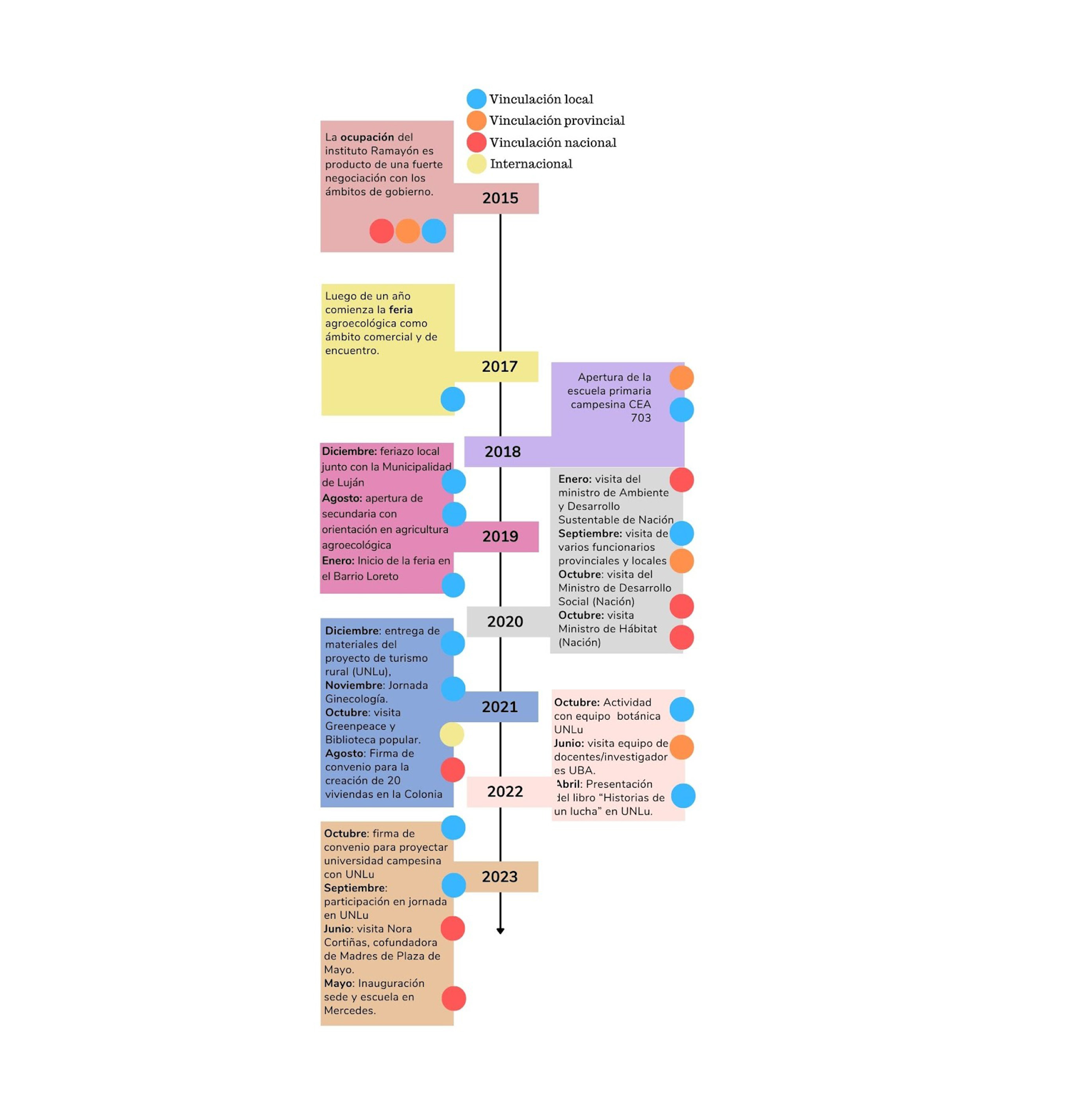 En el ámbito local, la acción colectiva tuvo un punto de máxima expresión en el año 2015 con la ocupación de las 80 hectáreas donde hoy se desarrolla la Colonia, pero tuvo su génesis en al menos 3 años de construcción política, hacia dentro y fuera de la organización. Luego de la toma, la estrategia ha tomado un viraje al entramado de vínculos territoriales, con los barrios, vecinos y el Estado fundamentalmente en el ámbito nacional y provincial.