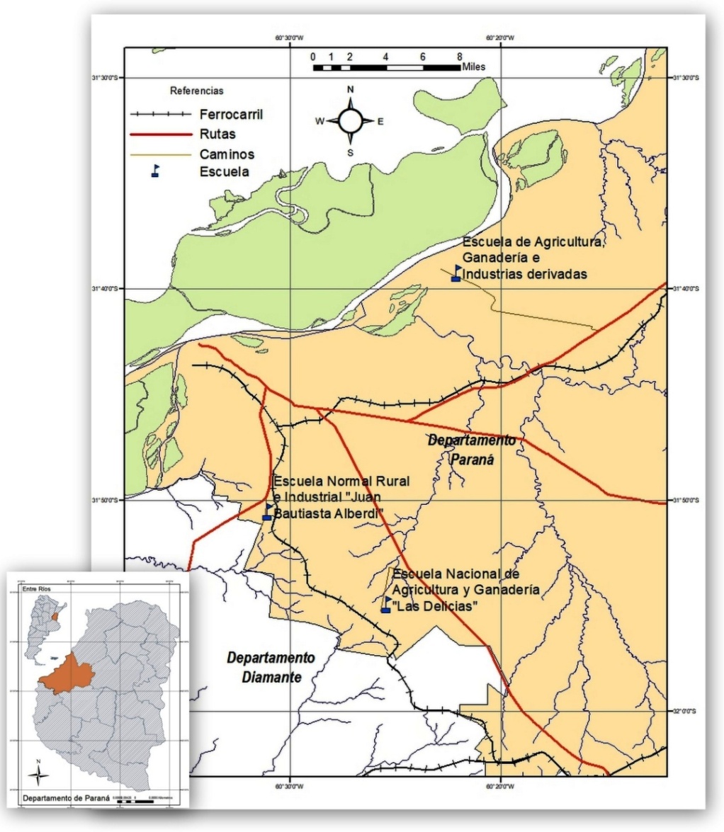 Dos años después de la creación del MAN se instaló en la provincia de Entre Ríos una institución de su dependencia que se localizó en una zona distante a 30 km de la capital, en un área de colonias y aldeas inmigrantes rusos-alemanes del Volga- e italianos (Figura 1). Por decreto del MAN, el 3 mayo de 1900, se fundó una Escuela Elemental de Agricultura y Ganadería que tenía la finalidad de formar capataces e idóneos. En esa norma se nombraba al ingeniero agrónomo belga Adolfo C. Tonnelier -que hasta ese momento se desempeñaba en la estación agronómica de Chubut- como director y a Hugo Ferrando como ayudante secretario, encargado de algunas tareas administrativas y contables. El predio de la novel institución comprendía 300 hectáreas con la infraestructura de la estancia “Las Delicias” que había pertenecido al ex gobernador Sabá Hernández, participe de los últimos levantamientos armados internos que registró la provincia en marzo de ese año (Reula, 1971, p. 205). El PE provincial realizó la donación del predio al gobierno Nacional y meses después se formalizó mediante la aprobación de la Ley Nº 1.758, cuyos fundamentos señalaban la urgente necesidad de instalar un establecimiento de este tipo en la provincia, aprovechando el interés que tenía el MAN en el fomento de institutos de enseñanza agrícola. Apenas realizada la apertura, se dio inicios a las actividades con una planta de personal integrada por un director, un ayudante secretario, un carpintero horticultor, un encargado de caballeriza y carrero, un carpintero y seis peones. De inmediato se habilitó la inscripción de los jóvenes aspirantes, cuya solicitud de admisión se debía presentar por nota a la Dirección de Ganadería y Agricultura, situada en la Capital Federal. La edad mínima era de 17 años, debían tener cursado tercer grado de la educación común o, en su defecto, debían rendir examen de ingreso. Con un año de cursado se obtenía una habilitación para la fabricación de queso y manteca, un objetivo que el PE quería imprimirle con especial relevancia (República Argentina, 1900, p. 279). Con dos años de cursado se obtenía el título de capataces agrícolas y ganaderos; con otro año se podía optar por ser capataz especial en alguna de estas ramas (El Entre Ríos, 29/5/1900, s/p). Desde el MAN se proyectaba que ese año se daría una especial atención a la plantación de árboles que luego se distribuirían entre los agricultores.