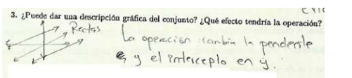 Una de las preguntas en este caso fué ¿Puede dar una descripción gráfica del conjunto? ¿Qué efecto tendría la operación? esta interrogante busca determinar si los estudiantes logran visualizar un efecto gráfico en la aplicación de la operación. En este sentido, la pregunta tiene un corte exploratorio, es decir, se esperaría que algunos estudiantes realizaran algunos dibujos de rectas (asumiendo que logran identificarlas como rectas) y que busquen darle algún sentido a la operación (que en la prueba se especifica que es la operación de composición).
