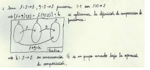 G = {f:S → S, f es 1 − 1 y f(s) ≠ s para un número finito de elementos s ∈ S} Demuestre que G es un grupo respecto a la operación ○, la composición de funciones.
