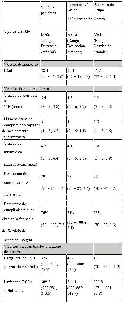 Las variables estudiadas fueron: a) Demográficas: Edad, sexo, vía de transmisión; b) Farmacoterapéuticas: Tratamiento ARV, medicación concomitante, tiempo de tratamiento ARV, tiempo con la terapia actual, número de formas farmacéuticas diarias que recibe el paciente, reacciones adversas asociadas a la terapia ARV, porcentaje de adherencia; c) Clínicas: Carga viral, recuento de linfocitos CD4. Estos marcadores se midieron al inicio del estudio y al menos 3 meses después de la implementación del seguimiento farmacoterapéutico. Para comparar el efecto del programa de SFT entre ambos grupos se aplicó una prueba de ANOVA de medidas repetidas con posterior prueba de Tukey, con un nivel de significancia de 0.05, para evaluar la diferencia entre las medias de los grupos. Todos los valores se reportan media ± error estándar de la media. Estos análisis estadísticos se realizaron utilizando el programa estadístico Prisma GraphPad versión 6.01.