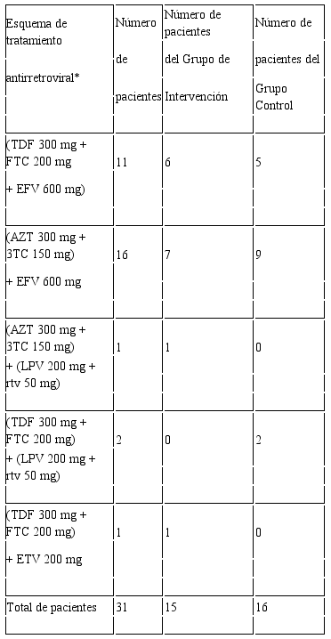 El estudio fue ofertado a 38 pacientes, de los cuales 31 aceptaron participar firmando el consentimiento informado; de ellos 15 fueron seleccionados para formar parte del grupo de intervención y 16 formaron parte del grupo control. El promedio de la edad de los pacientes en el estudio fue de 28.4 años. El 80.6% de los pacientes eran de género masculino y el 19.4% de género femenino. La vía de transmisión del VIH fue la vía sexual en el 100% de los pacientes.
