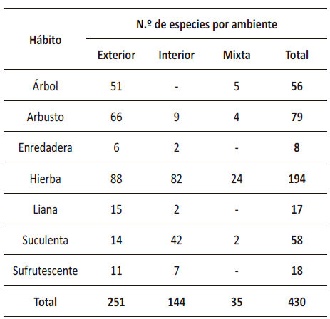 En el exterior, los hábitos más representativos son hierbas, arbustos y árboles. En ambientes de interior, los más importantes son las hierbas y las suculentas. Por su parte, en los ambientes mixtos dominaron las especies de hábito herbáceo (tabla 5). En los ambientes de exterior, para hierbas, las familias más representativas son Asteraceae (21 especies) y Iridaceae (6), seguidas de Amaryllidaceae, Caryophyllaceae, Geraniaceae, Plantaginaceae, Poaceae y Solanaceae, con cuatro especies cada una. En hábitos leñosos, las familias más importantes en términos de riqueza son Fabaceae (10 especies), Solanaceae, Myrtaceae y Malvaceae (7 especies cada una), Onagraceae y Moraceae (5 cada una) y Asteraceae (4 especies).