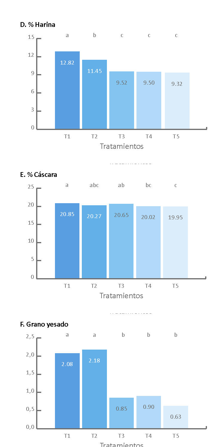 Igual que con las variables anteriores, el porcentaje de harina reportó diferencias significativas (p < 0,0001) entre tratamientos (figura 2D), siendo T1 el de mayor porcentaje (12,82 %) y T5 el de la cifra más baja (9,32%). Estos hallazgos coinciden con los resultados de Larios et al. (2010), quienes expresan que la fertilización con micronutrientes no solo mejora notablemente el rendimiento del cultivo, sino que además puede incrementar la calidad nutricional del grano, lo cual resulta importante y atractivo para los consumidores desde la perspectiva de la salud humana, puesto que adquirir un producto biofortificado es clave para contrarrestar problemas de desnutrición.