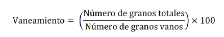 Para evaluar el componente de molinería (prueba de trilla) se utilizaron 500 gramos de granos por bloque. Las variables de producción fueron: densidad de plantas (plantas/m2), macollamiento (macollas/m2) y número de panículas por área (m2). Dichas variables se determinaron arrojando al azar dentro de cada tratamiento un marco de aforo de un metro cuadrado (1 m2), el cual es elaborado con cuatro varas de 1 metro de largo unidas por sus extremos, formando exactamente un cuadro. Se tomaron 6 panículas al azar por réplica, 24 panículas por tratamientos. Se seleccionó el número de granos totales (ngt) de las panículas para determinar el número de espiguillas. Posteriormente, por panícula se contó el total de granos y estos se dividieron en número de granos llenos (ngli) y número de granos vanos (ngv) para así determinar el porcentaje de vaneamiento (%Vano), el cual fue calculado a partir de la siguiente fórmula: