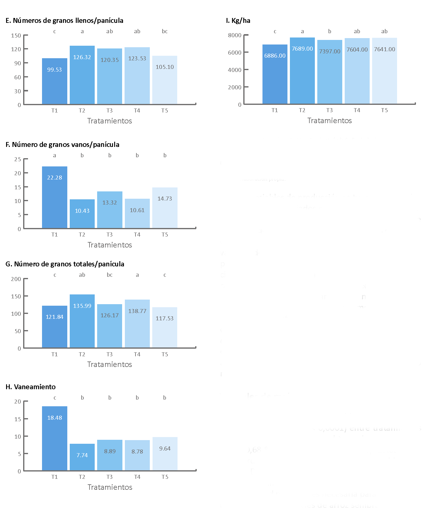 En la misma línea, la variable número de granos totales por panícula (ngt) presentó diferencias significativas (p 0.0002) entre tratamientos (figura 1G), donde T4 (138,77) presentó el mayor número de granos totales por panícula, mientras que T1 (121,84) y T5 (117,53) reportaron los valores más bajos. Los resultados para esta variable concuerdan con lo expresado por Meena y Fathima (2017) y Saha et al. (2017), quienes manifiestan que la aplicación de elementos al suelo es importante para la obtención de un mayor número de granos por panícula, aunque esta debe ser complementada con aplicaciones vía foliar.