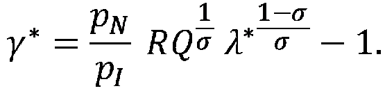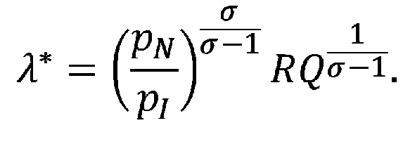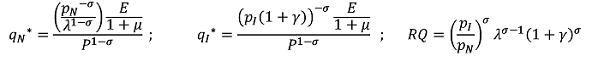 La solución a este problema determina las demandas de equilibrio de los productos nacional e importado, así como la demanda relativa, , la cual muestra el impacto del precio relativo en el “margen intensivo” de sustitución (es decir, manteniendo fijo ):