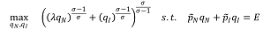 El segundo paso consiste en modelar la demanda de los consumidores. Suponemos que existe un consumidor representativo cuyas preferencias pueden representarse a través de una función de utilidad del tipo CES (Elasticidad de Sustitución Constante) definida sobre las cantidades consumidas de producto nacional e importado, y respectivamente. Este consumidor representativo maximiza dicha función de utilidad sujeto a una restricción presupuestaria: