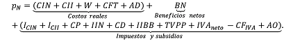 El precio del bien producido bajo el subrégimen industrial de Tierra del Fuego () en depósito del retailer se puede descomponer entre las partes que representan costos reales, beneficios netos (BN) e impuestos y subsidios. La siguiente ecuación describe al precio nacional como la suma de todas estas partes: