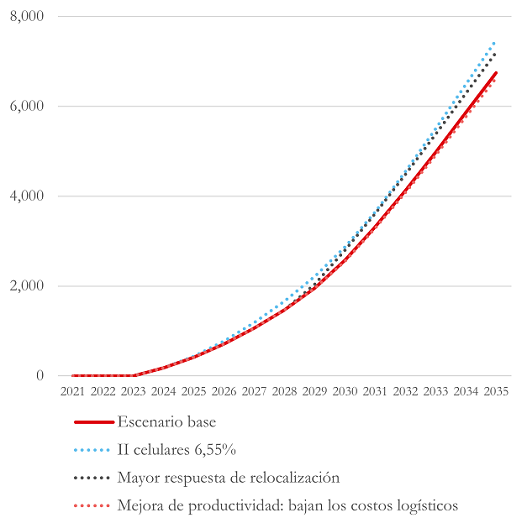 Como se puede observar en el panel A del Gráfico 7, en este segundo escenario alternativo la caída en el empleo acumulado hasta 2034 se reduciría en 886 empleos (12 % menos) comparado con el escenario base (6369 versus 7254 empleos perdidos). La mayor parte de esta diferencia se explica por la recuperación de producción en acondicionadores de aire con respecto al escenario base. En este escenario alternativo, el 58 % de la producción de este producto permanecería en la isla, comparado con el 28 % proyectado según el escenario base. En el caso de los televisores, dicho porcentaje mostraría una limitada variación (de 61 % a 63 %), mientras que en teléfonos celulares la caída en los costos de logística no impediría el desplazamiento total de la producción local por oferta importada. Por otra parte, como se ve en el panel B Gráfico 7, el ahorro fiscal anual de largo plazo terminaría siendo US$ 25 M menor (3 % menos) que en el escenario base (US$ 856 M versus US$ 881 M). Asimismo, el ahorro fiscal acumulado entre 2024-2034 disminuye US$ 89 M (2 % menos) comparado con el escenario base (US$ 5776 M versus US$ 5864 M).