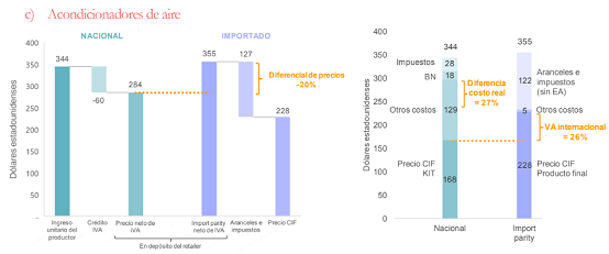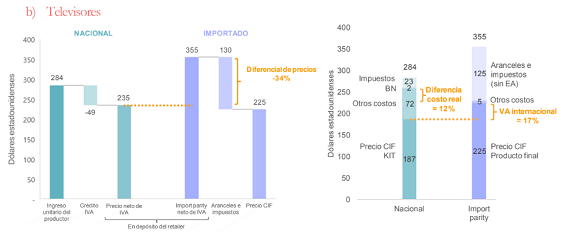 Estas diferencias en el costo real, que favorecen a los bienes importados, son ampliamente contrarrestadas por una mayor carga impositiva hacia dichos bienes. Como ejemplo, sólo el diferencial de impuestos internos, o alternativamente sólo el crédito fiscal por IVA, más que compensan la diferencia de costo real en teléfonos celulares y televisores, mientras que casi la compensan en acondicionadores de aire. De esta forma, las medidas de protección no arancelarias (cuyo EA no se incluye en el gráfico) son redundantes para conferirle competitividad a la producción nacional, sólo profundizando su preeminencia en el mercado interno –en el cual las importaciones son casi nulas–.