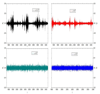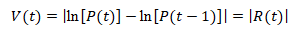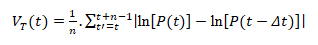 (3)Sobre una ventana de tiempo , donde es un entero positivo y es el intervalo de tiempo. En nuestra notación es un promedio de valores absolutos del retorno logarítmico, lo que puede ser pensado como un promedio simple para la escala . Si es pequeño, el promedio es más sensible a datos de alta frecuencia. La escala puede variar de al número máximo de observaciones en el tiempo. De aquí en más trataremos con , es decir: