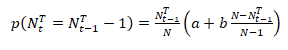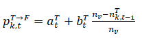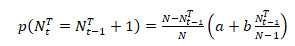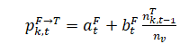 (8)Donde son las probabilidades de transición, de cada agente, de una estrategia a otra en el paso t-ésimo; dependiendo de un término constante, puramente aleatorio, y uno proporcional a la fracción de vecinos que ejercían la estrategia opuesta en el paso anterior. Formalmente se tiene que .