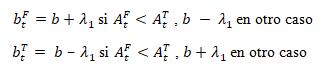 (10)Los dos términos de (10) tienen en cuenta, respectivamente, el rendimiento en t-1, dado por las expectativas (cumplidas o no ) en t-2 y su memoria del rendimiento anterior (con , , como parámetro de ponderación de la memoria). A su vez, las funciones y , excesos de demanda unitarios, son definidas en la sección 2.2., ecuaciones (17) y (19) respectivamente.