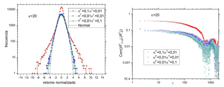 Se ha podido mostrar que la incerteza del conjunto de agentes sobre el precio esperado del mercado junto con la sensibilidad de ellos al cambio del precio son determinantes en el comportamiento del mercado. Por ejemplo, un comportamiento homogéneo de todos los agentes, cualquiera sea su estrategia ( y ), se condice con un mercado normal cercano a las HME. En cambio, las diferencias de incerteza y/o respuesta, junto a un “intermitencia” en la elección mayoritaria de estrategia, genera los HE observados (colas gordas y volatilidad agrupada). Sobre ellos, podemos decir que su aparición se da conjuntamente; diferenciándonos de la sugerencia de Tseng y Li (2011).