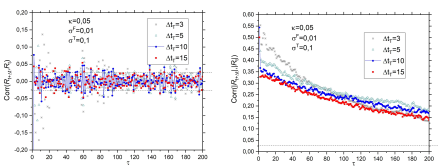 Las autocorrelaciones del valor absoluto, del cuadrado o de mayores potencias del retorno son generalmente conocidas como autocorrelaciones no lineales. De la figura 2 observamos que si bien la autocorrelación del retorno (correlación lineal) caía a un nivel de ruido para cercanos a 1; la función de autocorrelación del valor absoluto del retorno, es decir la correlación no lineal, exhibe un comportamiento de decaimiento exponencial mucho más lento. Los investigadores han asociado este decaimiento con una ley de potencia, pero no está claro si este decaimiento lento implica una memoria a largo plazo de las series de tiempo financieras (Cont, 2007). Sin embargo, también hay que tener en cuenta que si esto ocurre y la distribución es de colas pesadas, muchos de los procedimientos de estimación estándar (es decir, de examen de autocorrelaciones de la muestra) pueden dejar de ser correctos (Resnick, 1998; Cont, 2007).