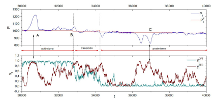 Además, en la misma figura, se distingue un periodo de optimismo seguido por la transición hacia el pesimismo disparada por una caída del precio fundamental (punto B).