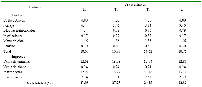 Rentabilidad. La mejor rentabilidad se alcanzó en el T2, con 30.72 % lo que significa, que por cada $ 100.00 USD de inversión se ganó $ 30.72 USD, mientras que el T1 fue el que generó menor rentabilidad con 4.15 %. Rendimiento superior al obtenido por Vega-Carrion10, obtuvo la mejor rentabilidad en el tratamiento donde usó el bloque nutricional más un probiótico, que obtuvo buenos pesos para la venta, lo que generó una rentabilidad del 21.22 %, tabla 5.