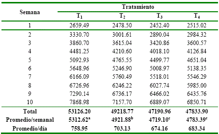 Consumo de Alimento. T1 presentó el mayor consumo de alimento, con un promedio de 5312.62 g por semana y 758.95 g diarios, T3 presentó el menor consumo con 4719.10 g semanales, tabla 1.