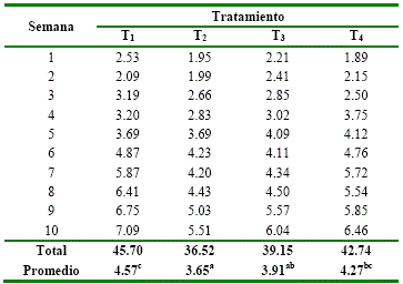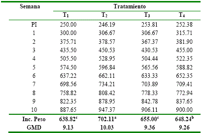 Incremento de Peso . Al inicio los pesos promedios iniciales variaron entre 246 y 253.8 g, a medida que avanzó el tiempo incrementaron uniformemente en todos los tratamientos, tabla 2 En la décima semana alcanzaron mayor incremento en T2, con 702.11 g y una media diaria de 10.03, presentando diferencia significativa (p≤ 0.05) frente los demás tratamientos. En tanto que el T1, registró menor peso con 638.82 g, y ganancia media diaria de 9.13 g, los T3 y T1 no presentan diferencia significativa (p≥ 0.05), tabla 2 Datos relativamente similares a los obtenidos por Paucar-Paucar8, quien realizó estudios en la evaluación del efecto del uso de bloques nutricionales como dieta suplementaria en la alimentación de cobayos, en la variable ganancia de peso (GP), no registraron diferencias estadísticas (p>0.05) entre las medias de los tratamientos, no obstante, se registró las mayores respuestas en los cuyes alimentados con el BN con el 17 % de proteínas con 687 g, y las menores ganancias en los BN con el 15 % de proteína con 578 g. Así mismo López-Moposita9, en la GP, reportó mayor en los cobayos de la línea Perú con el sistema de alimentación mixta (forraje+balanceado) con un promedio de 11.23 g/animal/día incremento de peso superior a los obtenidos en la presente investigación, y las menores ganancias de peso se registraron en los cobayos de la línea Andina con alimentación a base de forraje con un promedio de 8.07 g/animal/día, esta diferencia se podría deber a la cantidad de alimento que consumieron los animales durante el tiempo que duró la investigación.