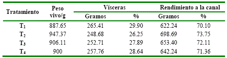 Rendimiento a la Canal. Para la evaluación de esta variable se registró el peso de los animales resultados expresado en porcentaje, tal como se muestra en la tabla 4. Existe diferencia significativa (p≤0.05) en los cuatro tratamientos, observándose mayor rendimiento en T2, con 73.75 %; seguido con el tratamiento T3 72.11%. Resultados ligeramente inferiores a los presentados por Imba-Chontasi & Tallana-Chimarro11, que en su experimento manifiesta que el mejor rendimiento a la canal obtuvo en el grupo alimentado con BN con harina de rastrojo de maíz al 10% con un porcentaje de 76.19%, y que esto se debió a que la harina de rastrojo de maíz es determinante por su contenido de proteína y fibra para la generación de músculo.