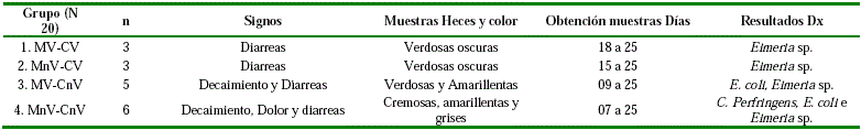 Comparación de la presencia de Clostridium perfringens en animales vacunados con los no vacunados y diagnóstico de la enfermedad. En tres crías de los grupos 1 y 2 solo presentaron signos de diarreas verdosas oscuras, a los análisis de heces observó Eimeria sp, siendo la presencia de las Eimeria sp. en el grupo 2 a los 15 días y en grupo 1 a los 18 días de nacidas, en el grupo 3, las crías presentaron signos de decaimiento y diarreas, aislándose de las heces diarreicas verdosas y amarillentas a partir de los nueve días Escherichia coli y a partir del día 15 de nacidas Eimeria sp. En el grupo 4 seis crías presentaron decaimiento dolor y diarreas cremosas amarillentas y grises desde los siete días de nacidas aislándose Clostridium perfringens y E. coli y a partir del día 15 se observó Eimeria sp.