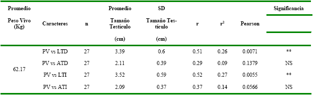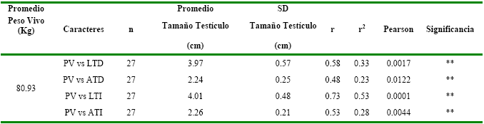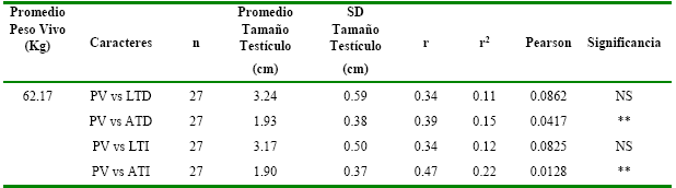 En la tabla 3 se observa la correlación entre el peso vivo (PV) y el largo testicular derecho (LTD) e izquierdo (LTI) en animales de 1 año son positivas y altamente significativas estos resultados pueden ser atribuidos a que en esta edad los testículos desarrollan conforme se incrementa el peso vivo.