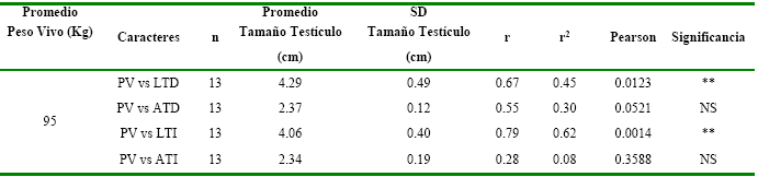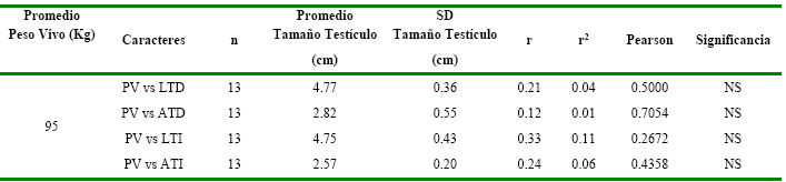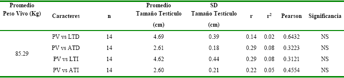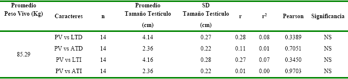 Para el peso y el largo testicular derecho (LTD) y el largo testicular izquierdo (ATI), la correlación no es significativa, lo que explica que el peso vivo no influye en el desarrollo del largo testicular.