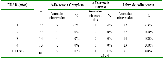 En la tabla 11 se observa que las llamas de 1 año de edad de un número total de 27 animales 9 presentaron adherencia completa que representa el 33% del total de animales observados, en cuanto a la adherencia parcial solo se observó 1 animal que representa el 4% del total y con respecto a los animales con libre de adherencia fueron 17 que representa el 63% del número total.
