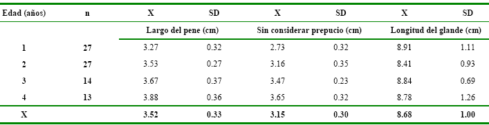 Los resultados reportados por (Galotta & Márquez 1994) con respecto al largo de la porción libre del pene difieren ligeramente con los datos del presente estudio, esto podría ser atribuido a distintos factores como: alimentación, al tipo de forraje que consumían los animales en su medio ambiente, al respecto (Pimentel et al. 2005) menciona que el efecto del medio ambiente, es el factor que tiene mayor impacto en el crecimiento de los animales, otro factor que pudo influir en los resultados podría ser la metodología seguida para obtener las medidas biométricas.