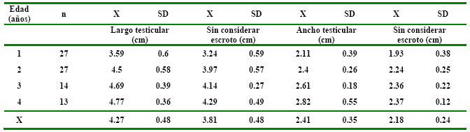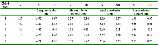 La tabla 1 presenta promedios de edad animal y del largo testicular derecho (LTD) de 3.24±0.59 a 4.29±0.49 cm (sin considerar el escroto) de 1 a 4 años de edad respectivamente, lo que demuestra su incremento a medida que avanza la edad de los animales, por lo mismo el promedio del largo testicular derecho en el presente estudio fue de 3.81 cm.