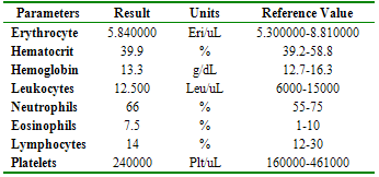 As diagnostic plans were suggested, hematic picture and blood biochemistry, in the results it is observed that it is within normal parameters (table 1 and 2), and an X-ray in lateral position and ventral dorsum of the forearm to observe the radius and the distal part of the ulna, the radiographic images indicate that it is a complete short-radius bevel fracture in the medial diaphysis and a complete transverse ulnar fracture at the distal diaphysis level is observed in the (figure 1 and 2), the radiological images of the described fracture, according to the AO classification (Association for the Study of Osteosynthesis) is type 22-A3.