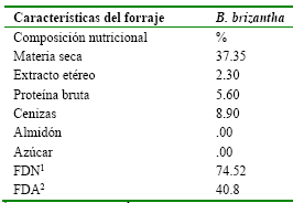 Parámetros evaluados. Se registró la producción de leche diaria (kg/animal/día), la composición de la leche (proteína, lactosa, grasa y solidos totales) con los dispositivos Lactoscan SPFP (Milkotronic, Bulgaria) y MilkoScan™ 7 RM (Foss®, España). El consumo diario de BMN se calculó cada día como la diferencia entre el peso inicial y final de los bloques dados utilizando una balanza High Weight® TP9000. Se recolectaron muestras de pasto de los potreros según la metodología de Carrere et al.19. El valor nutricional de la dieta de Brachiaria (B. brizantha), se observa en la Tabla 2. Los análisis pertinentes se realizaron en el LNABA de la UNTRM. El contenido de nitrógeno total (NT) para obtener el contenido de proteína bruta (PB)20, y las fracciones de fibra detergente neutra (FDN), ácida (FDA), y la lignina en detergente acida (LDA)21, con el equipo ANKOM® 220 (ANKOM Technology, Macedonia NY-USA).